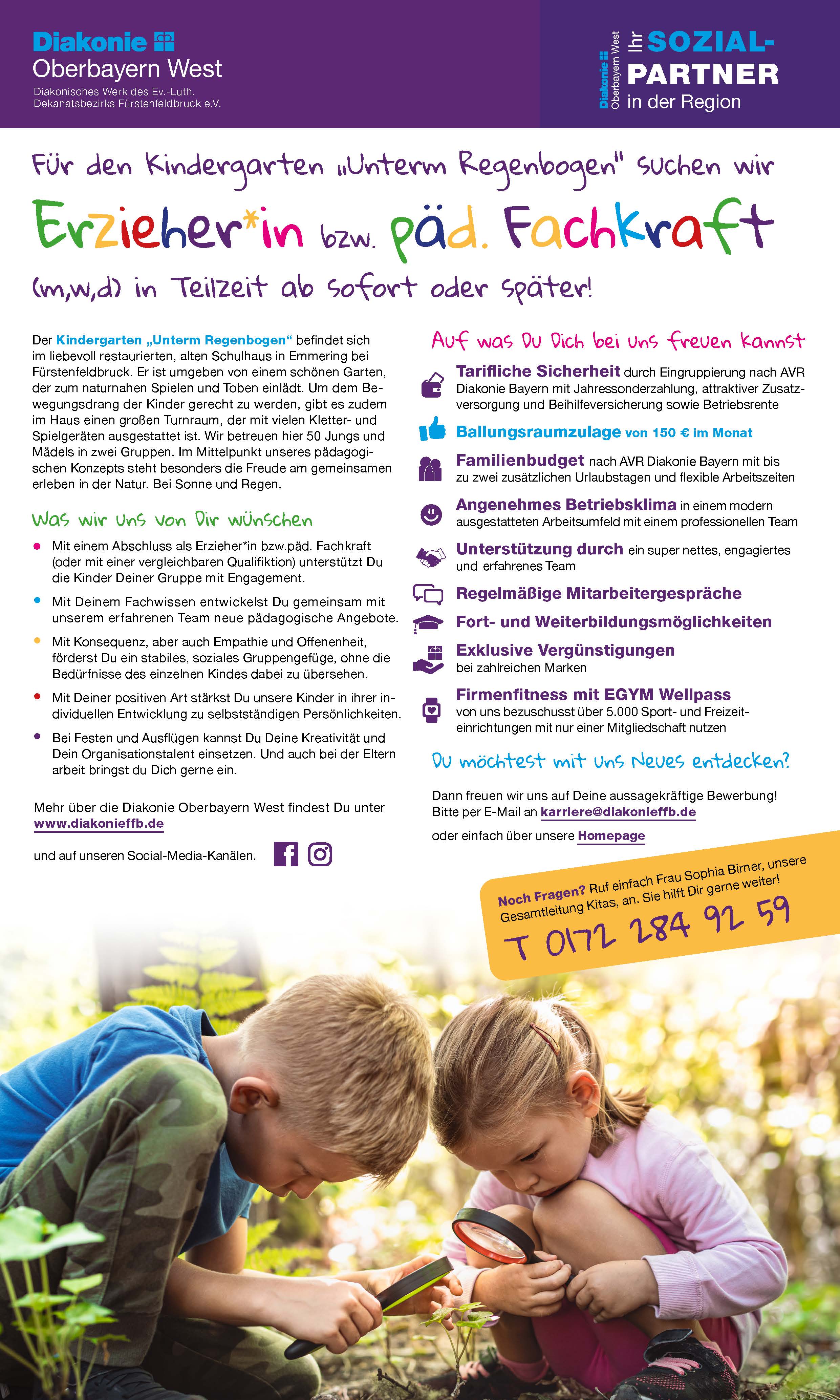 Der Kindergarten „Unterm Regenbogen“ befindet sich im liebevoll restaurierten, alten Schulhaus in Emmering bei Fürstenfeldbruck. Er ist umgeben von einem schönen Garten, der zum naturnahen Spielen und Toben einlädt. Um dem Bewegungsdrang der Kinder gerecht zu werden, gibt es zudem im Haus einen großen Turnraum, der mit vielen Kletter- und Spielgeräten ausgestattet ist. Wir betreuen hier 50 Jungs und Mädels in zwei Gruppen. Im Mittelpunkt unseres pädagogischen Konzepts steht besonders die Freude am gemeinsamen erleben in der Natur. Bei Sonne und Regen. Für den Kindergarten „Unterm Regenbogen“ suchen wir Erzieher*in bzw. päd. Fachkraft (m,w,d) in Teilzeit ab sofort oder später!