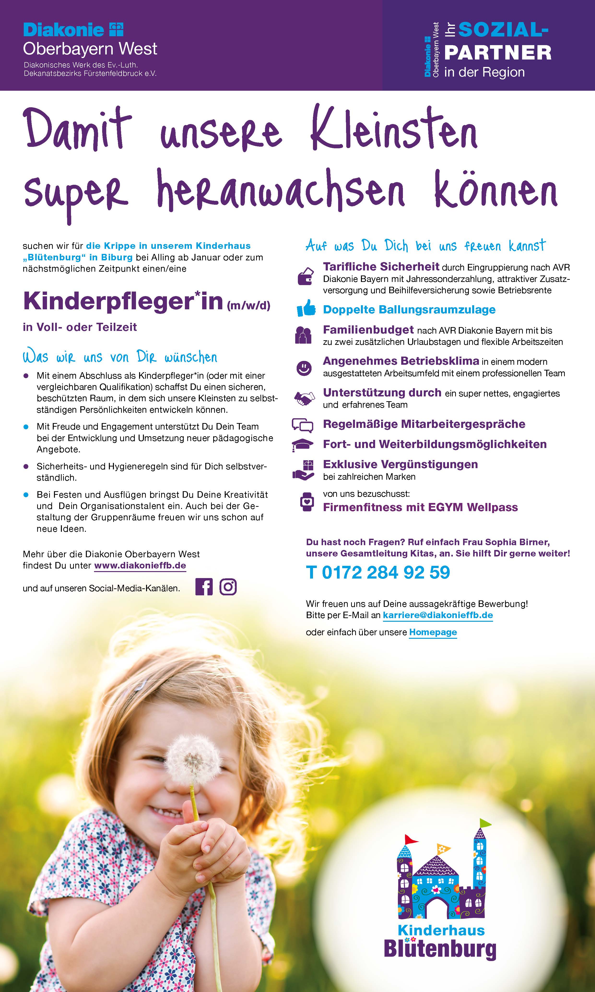 Damit unsere Kleinsten super heranwachsen können suchen wir für die Krippe in unserem Kinderhaus „Blütenburg“ in Biburg bei Alling ab Januar oder zum nächstmöglichen Zeitpunkt einen/eine Kinderpfleger*in (m/w/d)in Voll- oder Teilzeit